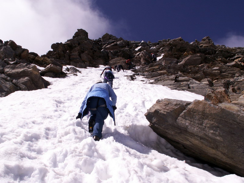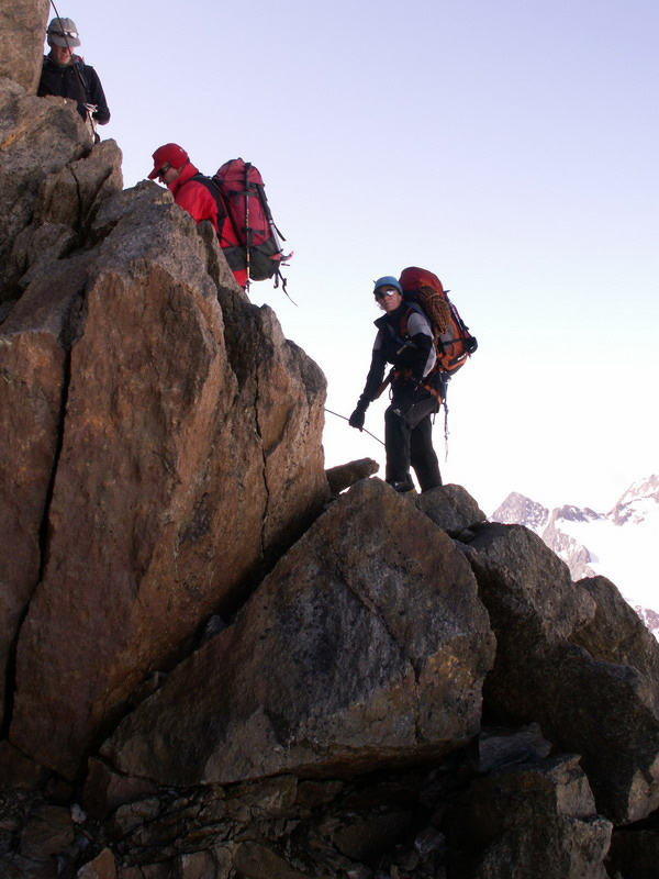 Aber nach kurzer Kletterei in Fels und Eis stehen alle auf dem Gipfel.
